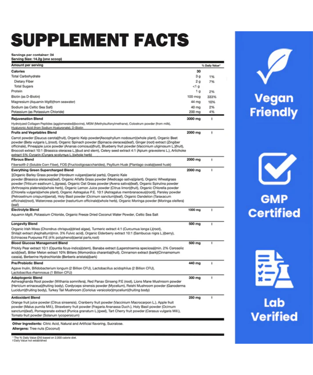 Meet your new daily ritual: a powerhouse superblend that fuels your body with everything it craves—without the hassle of taking a dozen separate supplements. This comprehensive formula is your one-stop shop for vibrant energy, immunity, gut health, recovery, and mental clarity.