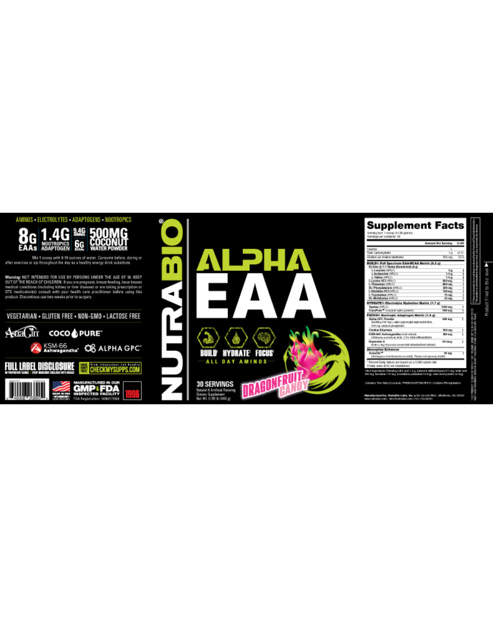Alpha EAA is an efficaciously dosed essential amino acid formula that is unlike any other amino acid product out on the market today. Not only does Alpha EAA include a full-spectrum EAA matrix featuring 8.2 g of EAA’s and 6 g of fermented BCAA’s but we added a focus and hydration complex as well. It’s this focus matrix that really puts this product over the top and differentiates it from any amino based supplement available. Our focus matrix is comprised of a combination of the world’s most popular adaptogen, Ashwagandha KSM-66 and three of the most effective supplements around, Alpha-GPC, VitaCholine and Huperzine A. To round out this novel formula and enhance it even more, we included taurine and CocoPure to support hydration and AstraGin to increase amino uptake and absorption.