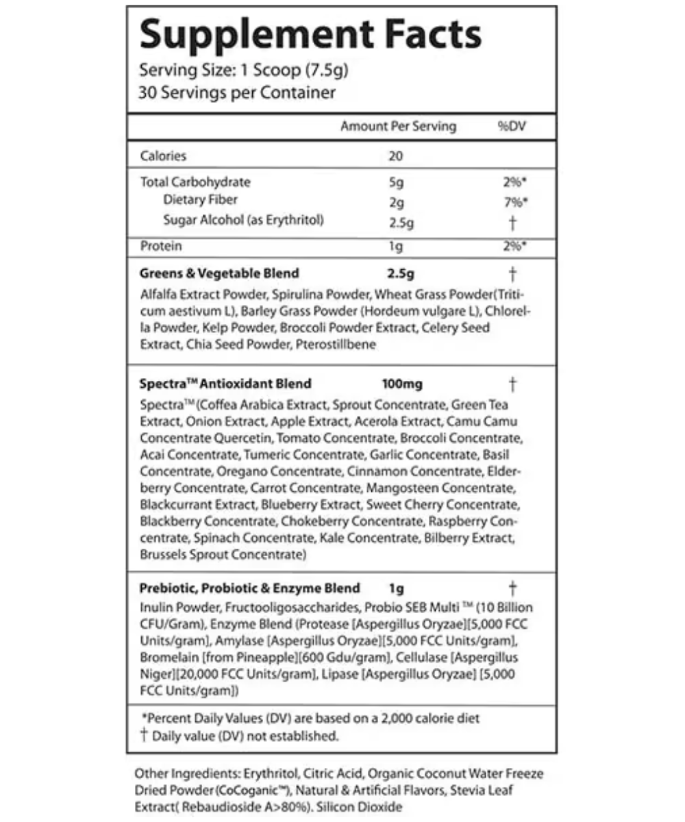 Alpha Supps® Greens has over 40 plant-based ingredients as well as Spectra™, prebiotic fiber, digestive enzymes, and Probiferrin® probiotics to support total body wellness and an healthier, active lifestyle.*