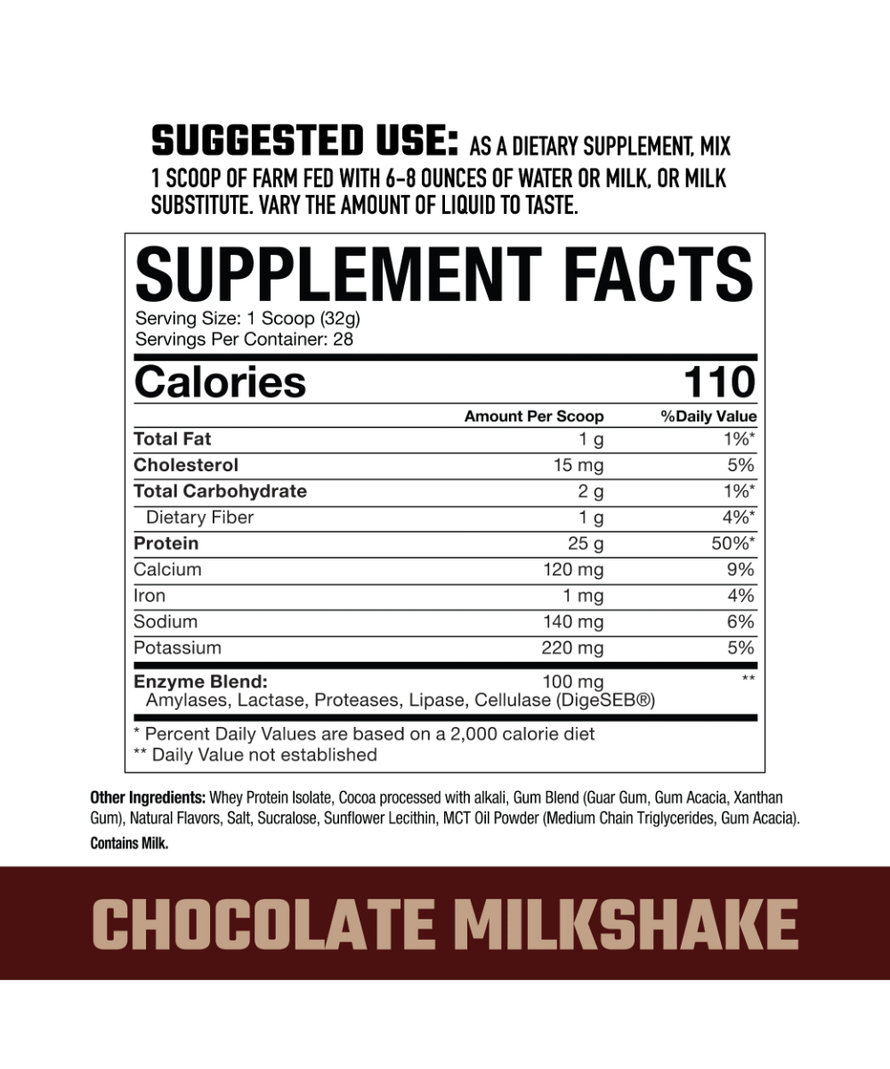 Farm Fed uses 100% whey protein isolate because it's one of the purest protein sources available. Farm Fed is low fat, low carb, low sugar, non-GMO, naturally rich in branched-chain amino acids and essential amino acids, and cold processed.