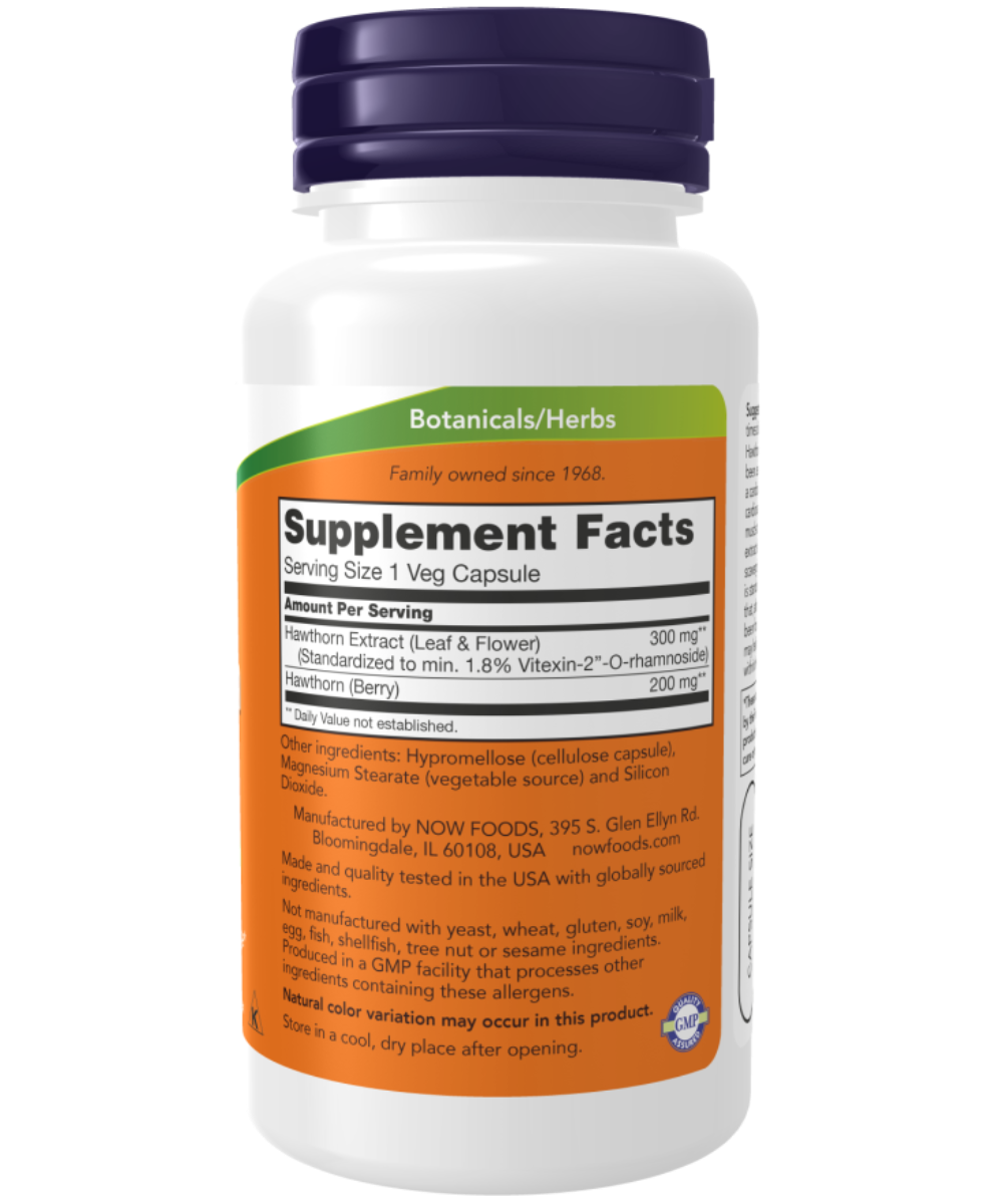 Hawthorn leaves, flowers and berries have been used for generations by herbalists as a cardiovascular tonic.* Hawthorn promotes cardiovascular health by supporting cardiac muscle tone and vascular integrity.* Hawthorn extract also exhibits powerful free radical scavenging activity.* NOW® Hawthorn Extract is standardized to 1.8% vitexin-2”-O-rhamnoside that, along with other natural components, has been found to support normal blood flow and may help to maintain blood pressure already within the healthy range.*