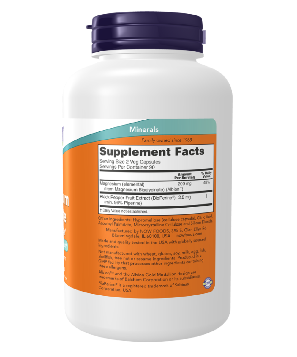 Magnesium glycinate utilizes magnesium bound to the amino acid glycine, which facilitates intestinal absorption.* Magnesium is a mineral that is critical for energy production and metabolism, muscle contraction, nerve impulse transmission, and bone mineralization.* It is a required cofactor for an estimated 300 enzymes.* Among the processes that require magnesium are fat and protein production, as well as glucose metabolism.* Magnesium status is also important for regulation of calcium balance through its effects on the parathyroid gland.* This product is enhanced with BioPerine®, a proprietary black pepper extract.