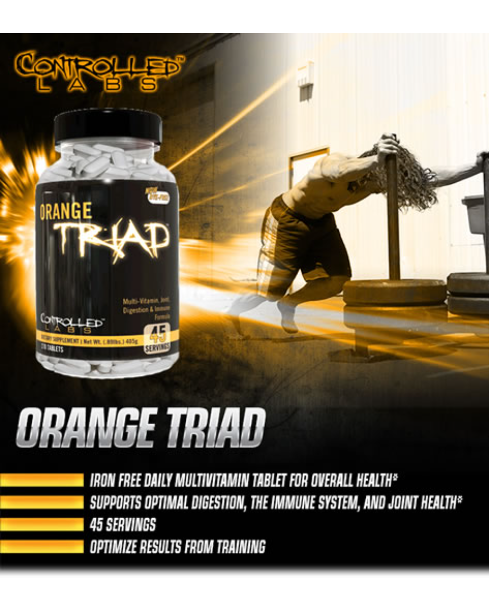 ORANGE TRIAD, the Best Supplement for Serious Athletes combines the most proven and effective vitamins, minerals, and nutrients for supporting optimal DIGESTION, IMMUNE system, and JOINT HEALTH into one “twice daily” dietary supplement. The JOINT and FLEX complexes help lubricate joints and cartilage as well as increase the resiliency of connective tissue, while the DIGESTION and IMMUNE complex includes natural anti-inflammatories, digestive aids, and nutrient partitioning agents to take your performance to the next level.