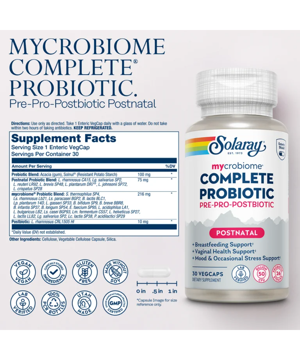 Powerful postnatal care: Meet your body’s unique needs after pregnancy with this expert-formulated, triple-action probiotic formula carefully crafted with ingredients that support breastfeeding, vaginal health, mood, occasional stress, and more.*