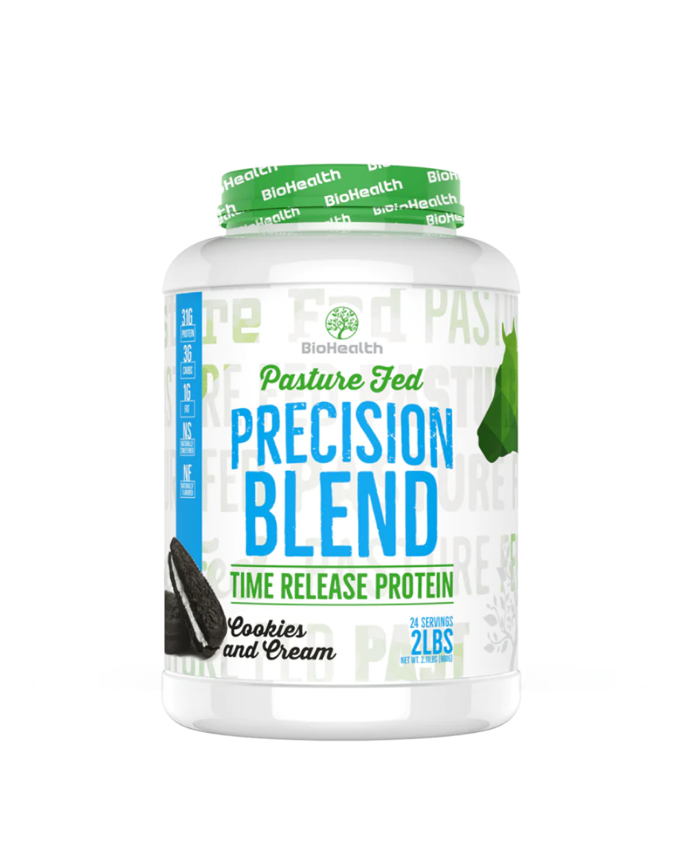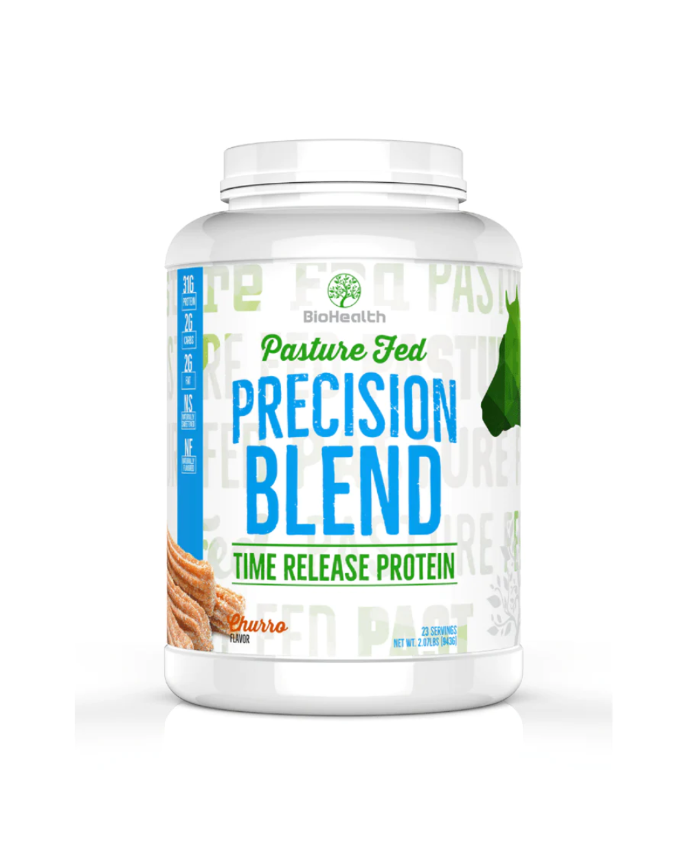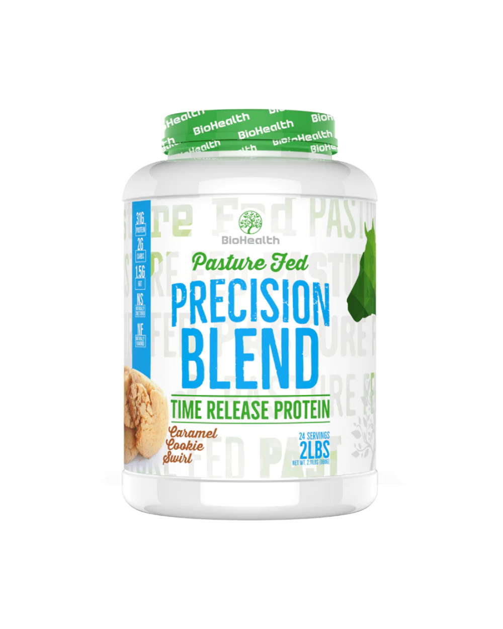 Precision Blend is made with premium pasture fed whey protein complex consisting of whey protein isolate, concentrate and casein for a high protein content with high but slower absorption. Precision Blend protein feeds cells with amino acids at a low level over a longer period to keep you satiated longer and left with more energy throughout the day.
