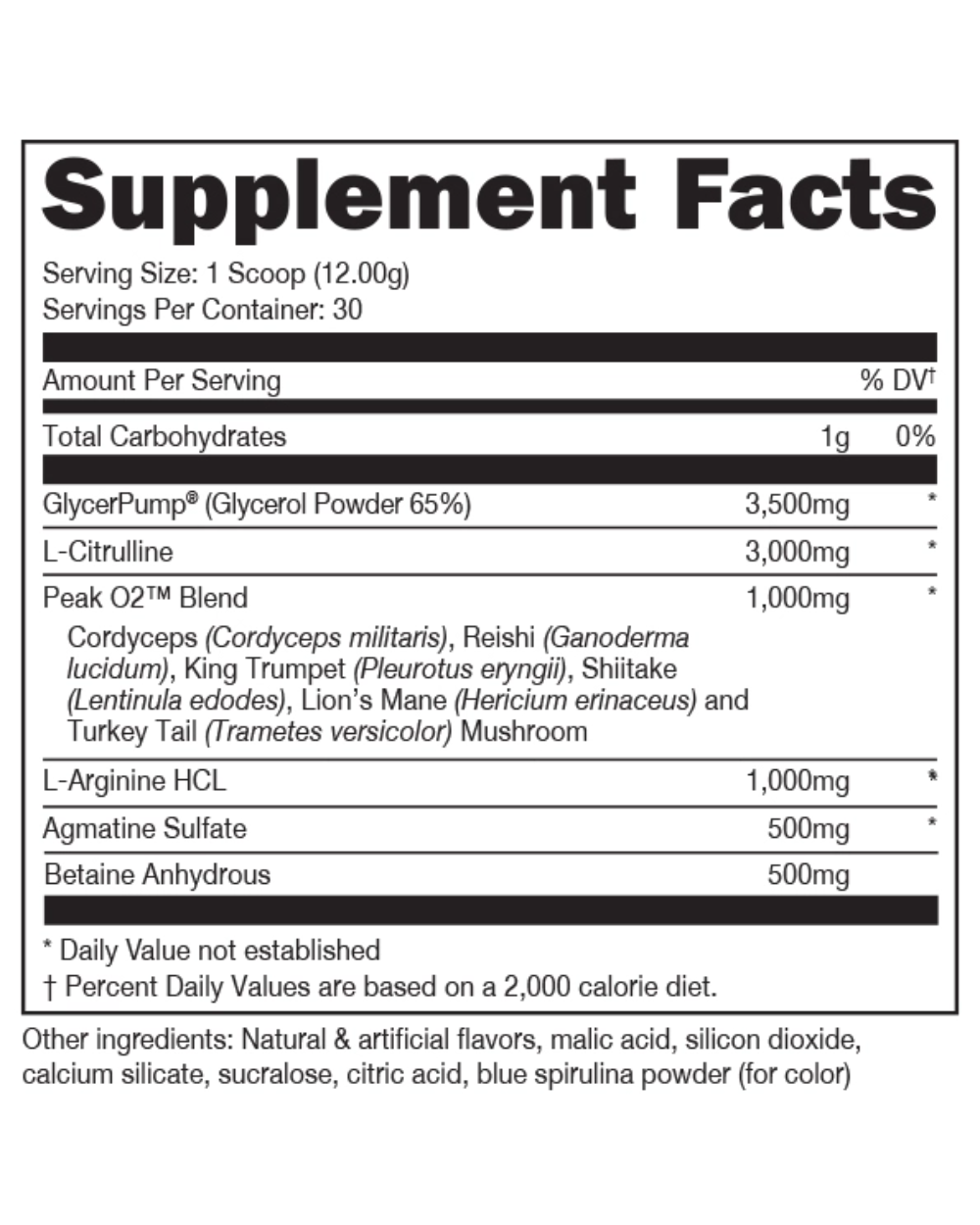 Most pump products work only on improving your pump -- surprise. Not us. We want more. We’re insatiable. You should be too. We add in PeakO2, which has been shown to increase power output over time.