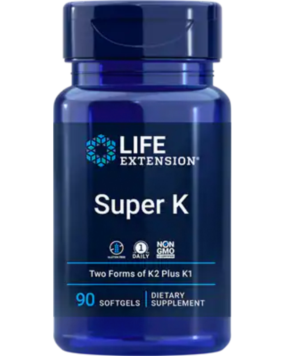 Super K provides three different kinds of vitamin K. Vitamin K1, the most common form of vitamin K, is typically found in the plant cells of leafy green vegetables and helps support optimal bone health and arterial health. The forms of K2 found in this supplement are MK-7 and MK-4, commonly found in some types of dairy.