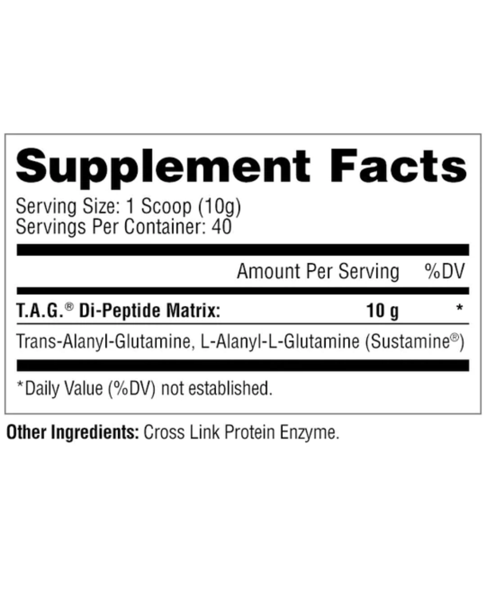 T.A.G.®, or Trans Alanyl Glutamine, is the only true Muscle-Targeted Glutamine. Due to its unique di-peptide bond, T.A.G. creates a jacket to protect glutamine all the way through to the muscle. T.A.G. is an ideal solution for muscle repair, reducing muscle tissue degradation, and enhancing recovery.*