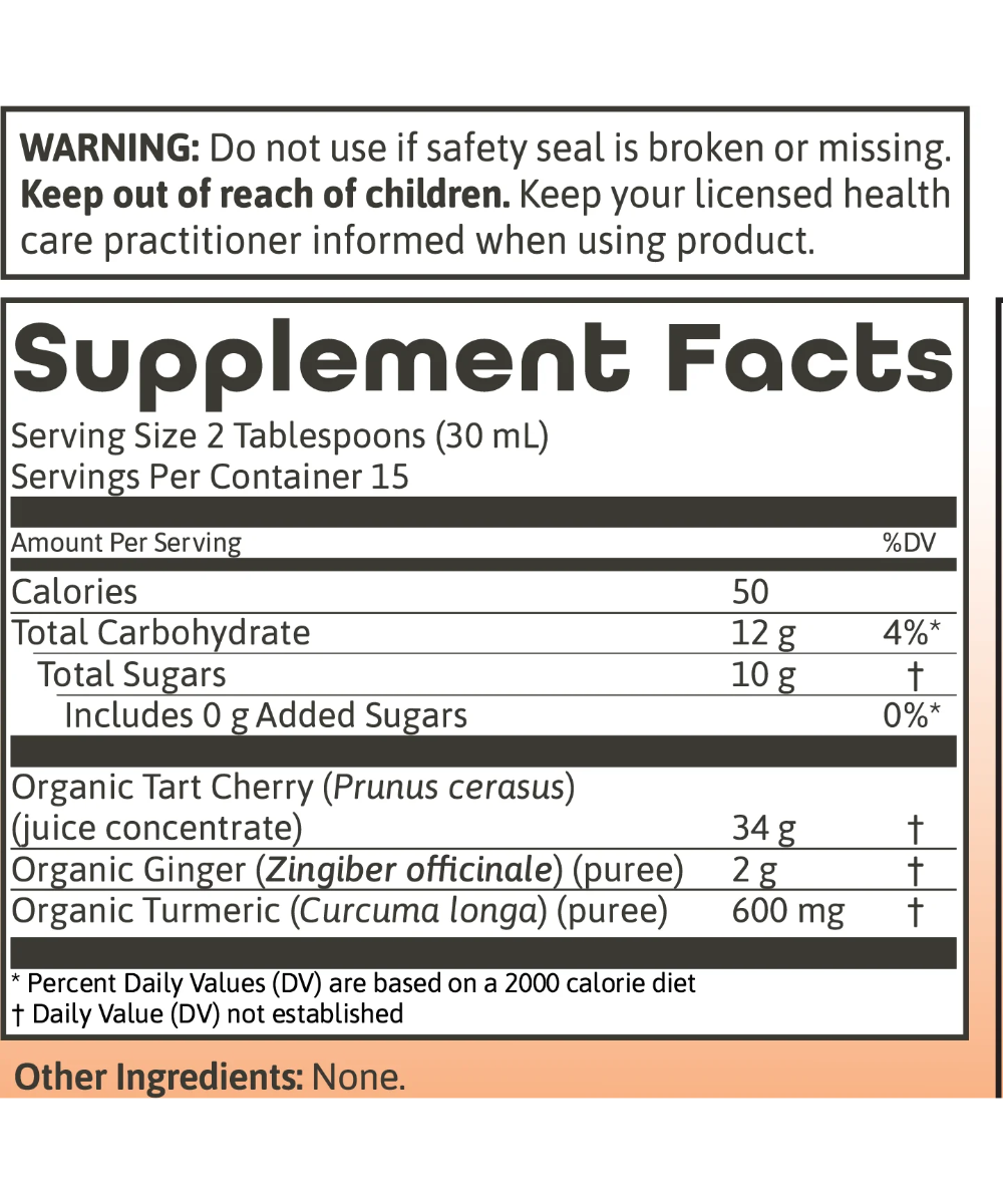 Pure and simple, nothing fuels your body for a fuller life like a splash of a whole-food, nutrient-packed, powerhouse tonic made of nature’s finest fruit and roots. Featuring organic Montmorency and Balaton tart cherry concentrate, organic turmeric, and organic ginger, our synergistic blend boasts beneficial anthocyanins, curcuminoids, gingerols, and even naturally occurring melatonin.