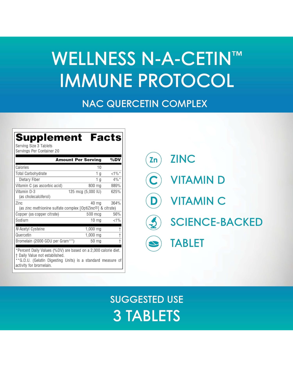 Get your immune system primed and ready for action with this highly specialized protocol. Taken daily or at the start of an immune imbalance, Wellness N-A-Cetin™ Immune Protocol delivers seven powerhouse ingredients for crucial immune defense. Featuring 1,000 mg each of quercetin & NAC, along with bromelain, the formula tackles a healthy inflammatory response and antioxidant support, which are both intimately linked with immune & respiratory health. Plus, it offers high potencies of zinc and vitamins C & D3, which support the production and stamina of critical immune cells. Following protocol isn’t just for those who go by the book—it’s for those who want to be ready for anything.*^